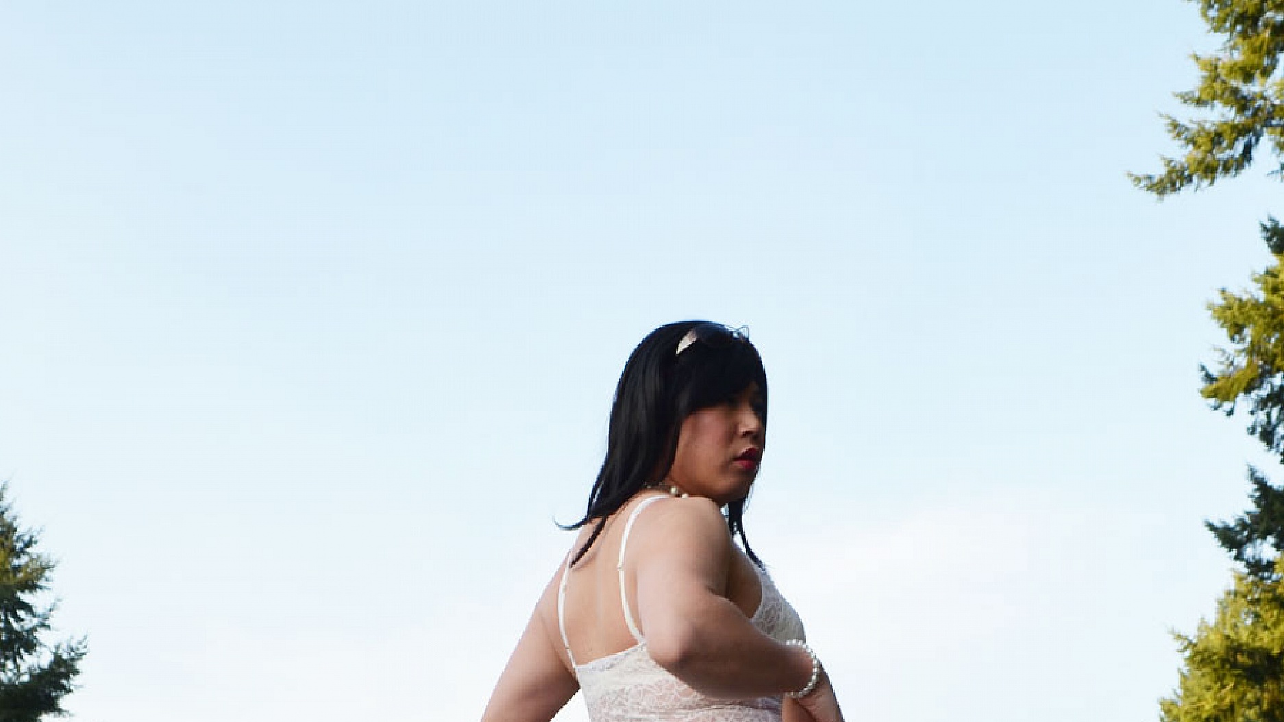 Outside in this photo gallery this week showcasing my body in this sheer white dress where you can see my ass through it.